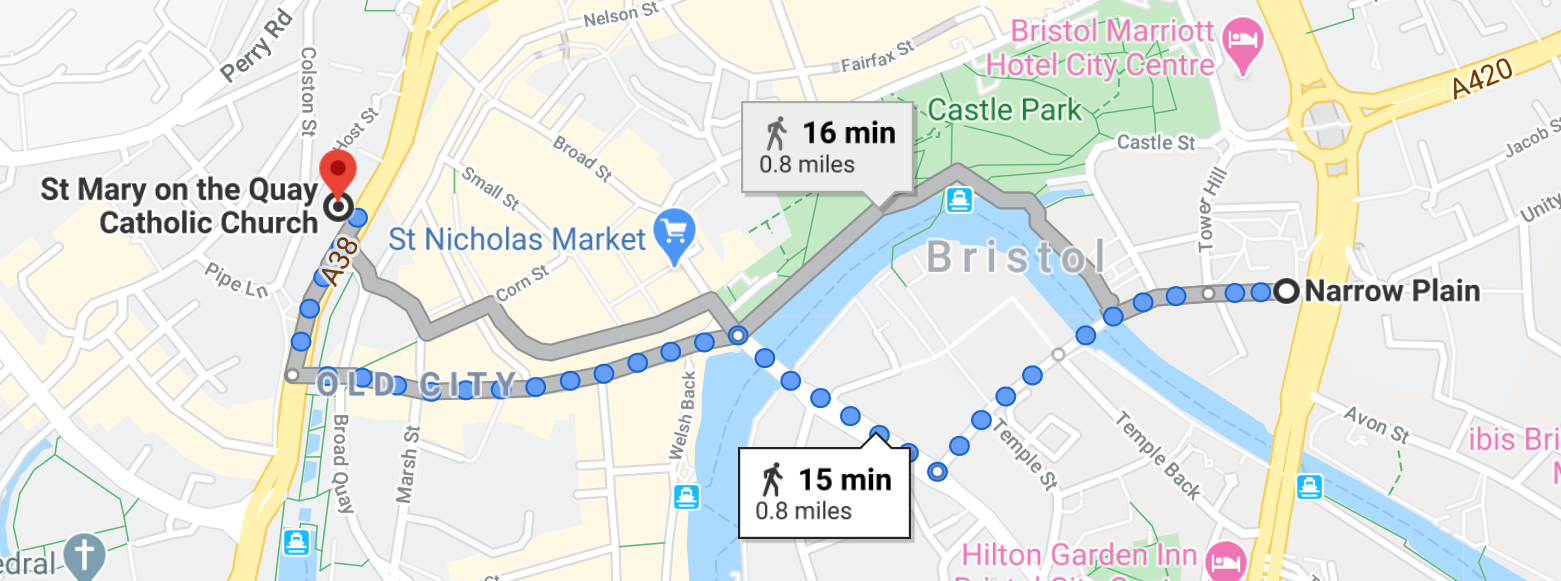 St Mary-on-the-Quay is a Roman Catholic church (Diocese of Clifton) and was completed in 1840. The architect was Richard Shackleton Pope. The River Frome flows in front of the church but was covered over in 1893.